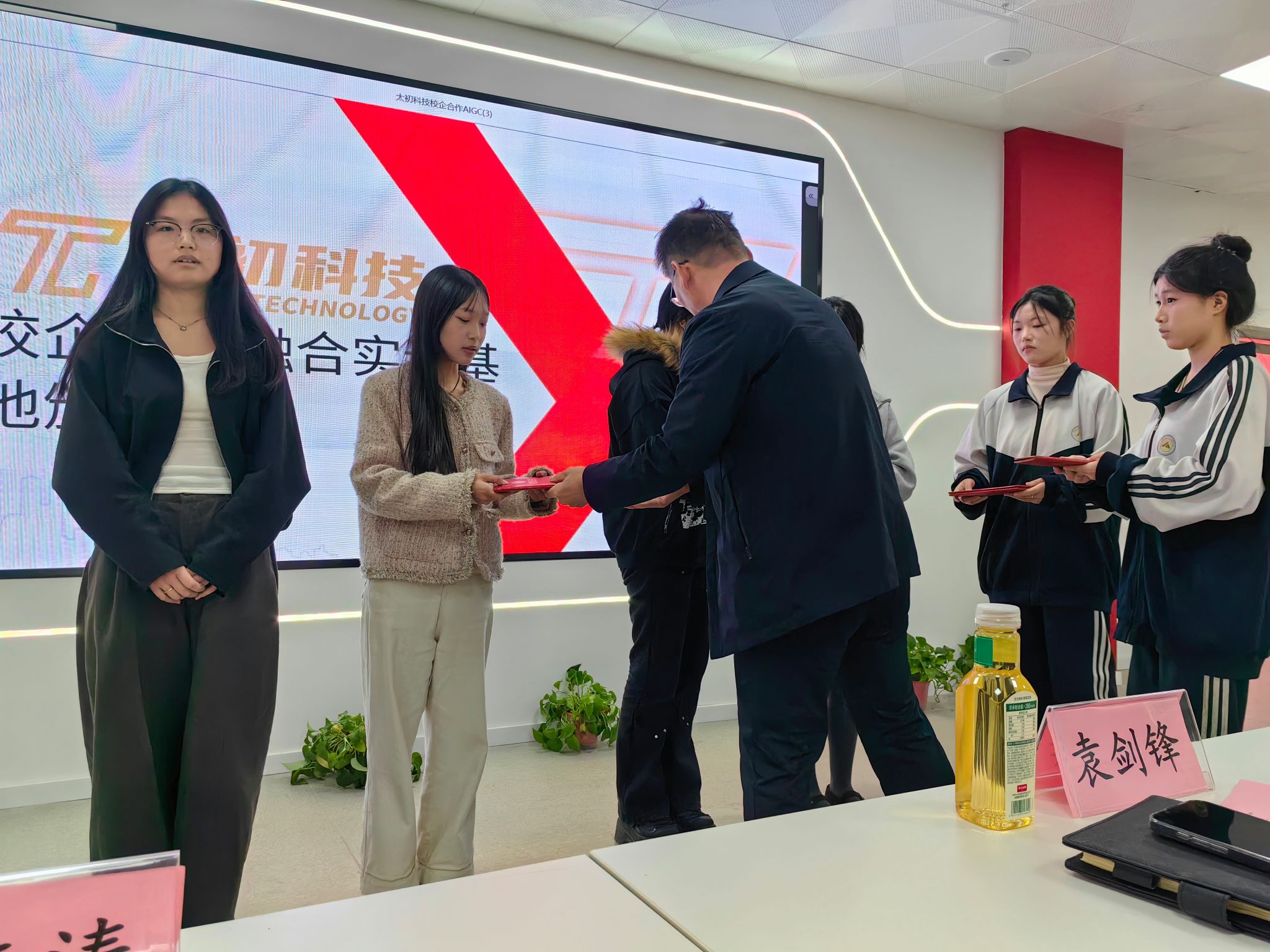 在激动人心的颁奖环节,袁剑锋、郑海涛、程韦齐共同为在实习实训中表现突出、获得优异成绩的学生颁发了荣誉证书和奖金。获奖学生们脸上洋溢着喜悦和自豪,他们的辛勤付出得到了企业和学校的共同认可。同时,几位受表彰的优秀学生分享了自己在太初科技直播实训中的感受和经验。