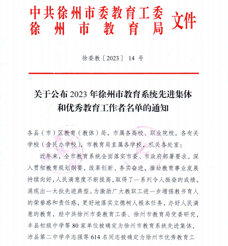2023年徐州市教育系统先进集体、优秀教育工作者表彰文件