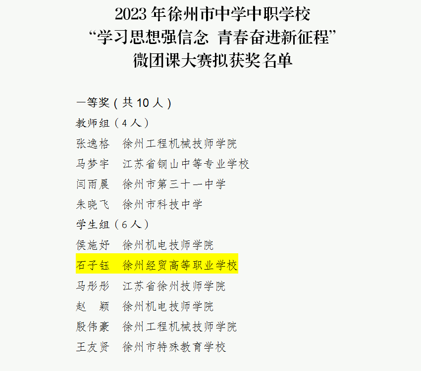 近日,在由团市委、市教育局举办的2023年度中学中职学校“微团课”大赛中,我校艺术设计系视觉高职201班石子钰、机电工程系汽服高职201班魏子晨同学分获学生组一等奖与二等奖,石子钰同学成功晋级省赛。12月上旬,共青团江苏省委主办的“菁菁杯”第八届江苏省中学中职学校“微团课”大赛省级决赛在南京举行。经过激烈角逐,石子钰同学凭借精心的教学设计与精彩的现场表现荣获学生组二等奖。