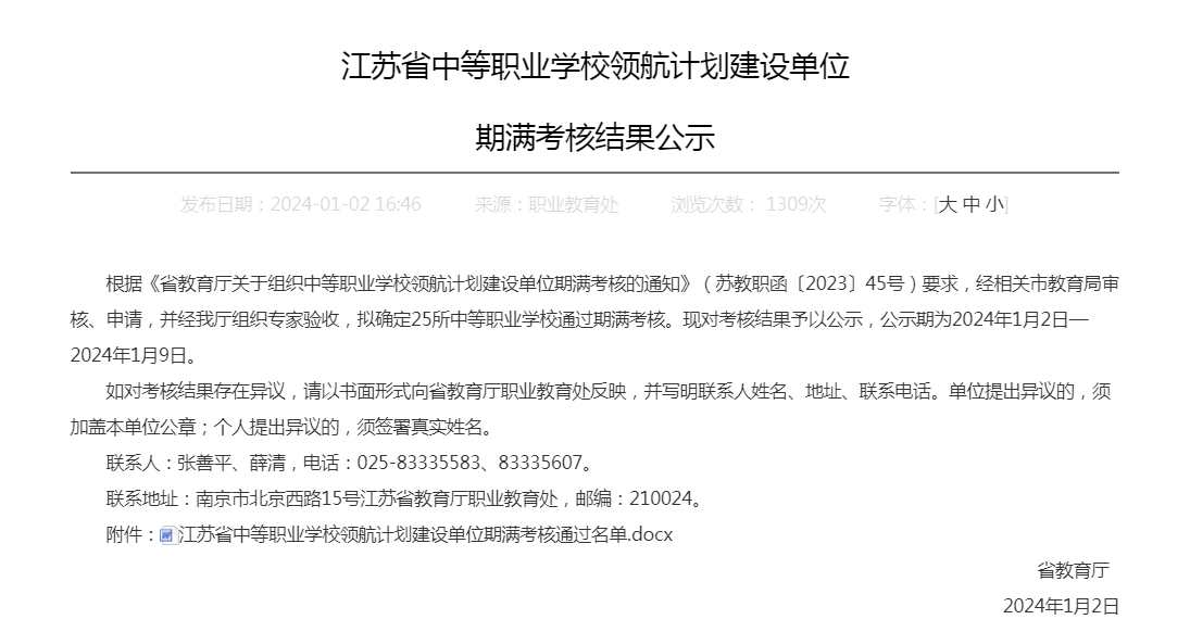 近日,江苏省教育厅发布《江苏省中等职业学校领航计划建设单位期满考核结果公示》,学校成功通过期满考核。