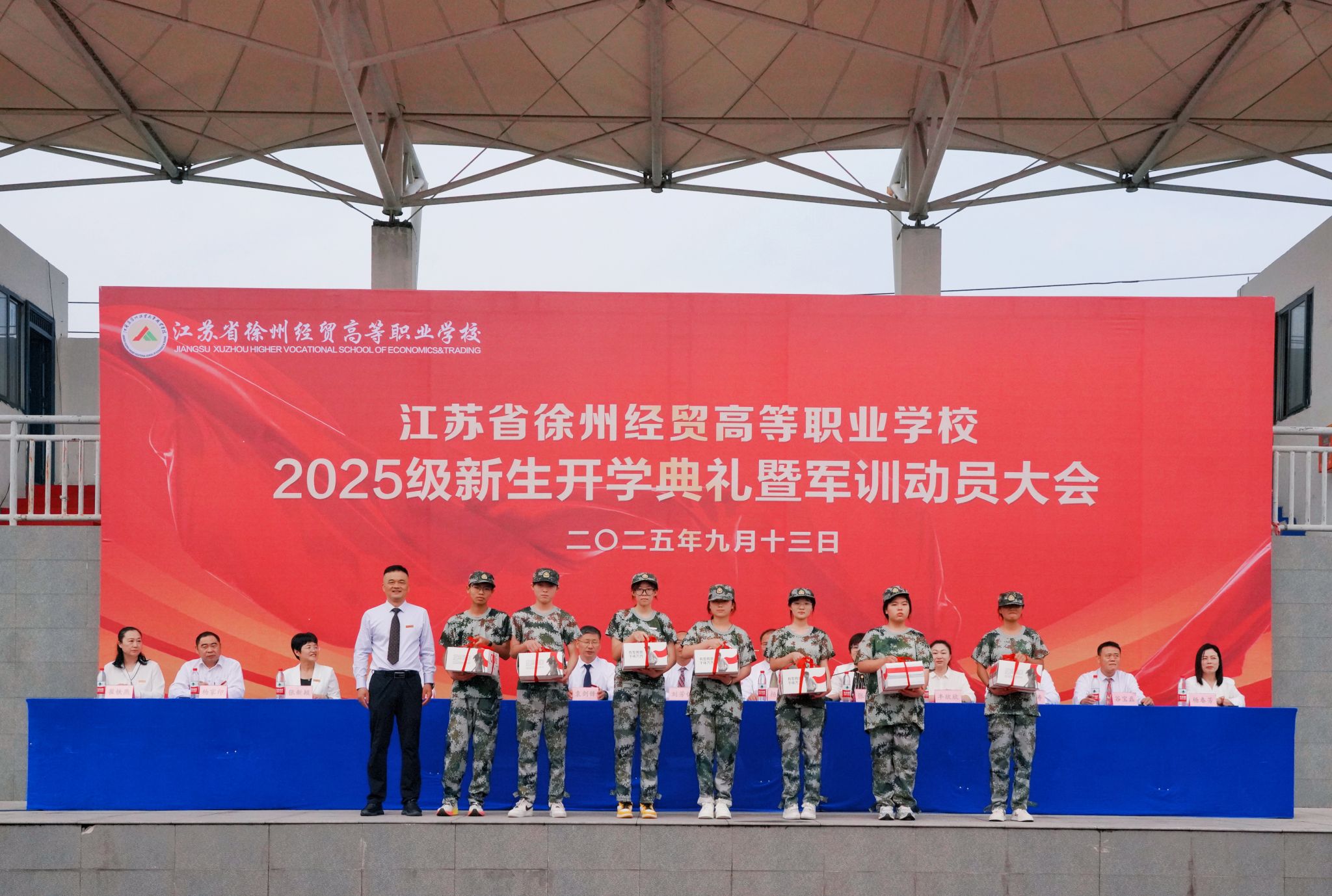 随后,典礼进入庄重而温馨的环节。各系部主任为新生代表佩戴校徽,杨政向各系部主任授系旗,系主任郑重接过系旗后,传递给学生代表。校徽熠熠,系旗飘扬,“经贸人”的身份深深烙印在每个人心中,归属与责任并存,梦想与使命同行。袁剑锋为荣获“2025级新生学习标兵”称号的同学颁奖,激励大家以优秀为镜、以奋斗筑梦。 特别温馨的是,学校还为七位恰逢生日的新生准备了生日蛋糕,校长助理、工会主席丁会兵代表学校送上真挚祝福,让新生在陌生的环境中感受到“经贸大家庭”的温暖,现场掌声不断。