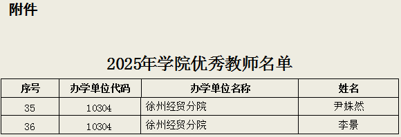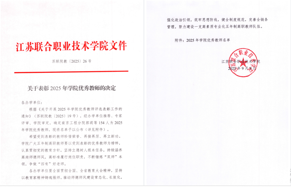 近日,江苏联合职业技术学院正式公布2025年度优秀教师评选结果,我校马克思主义学院尹姝然老师、管理系李景老师荣列其中。