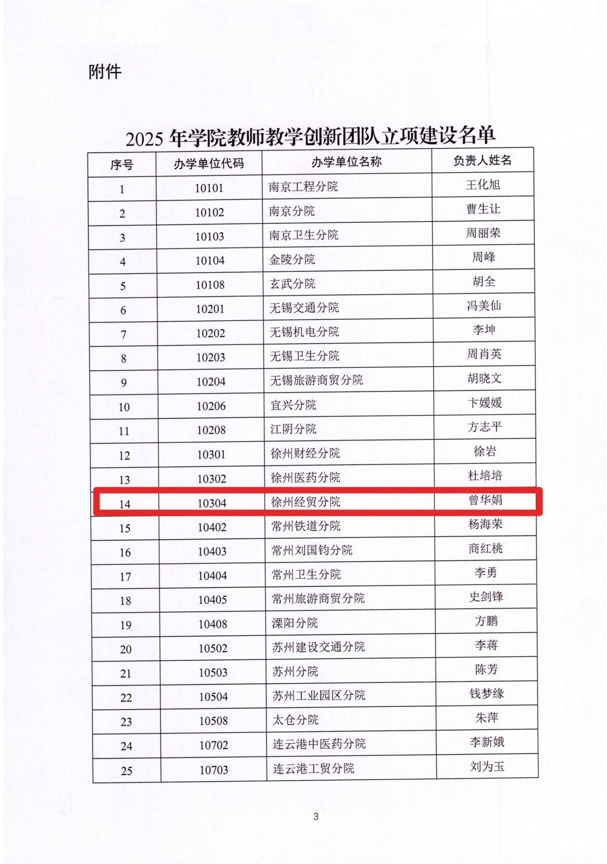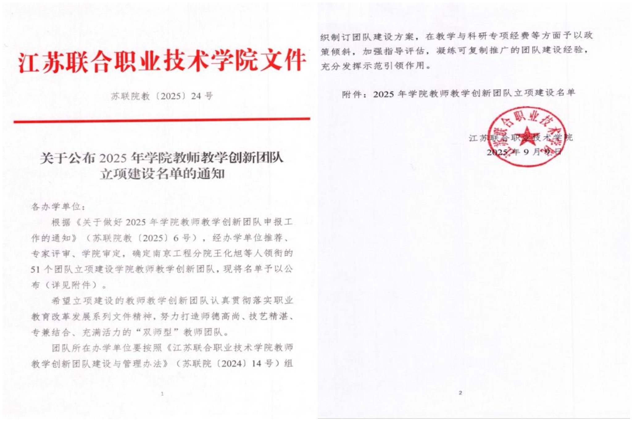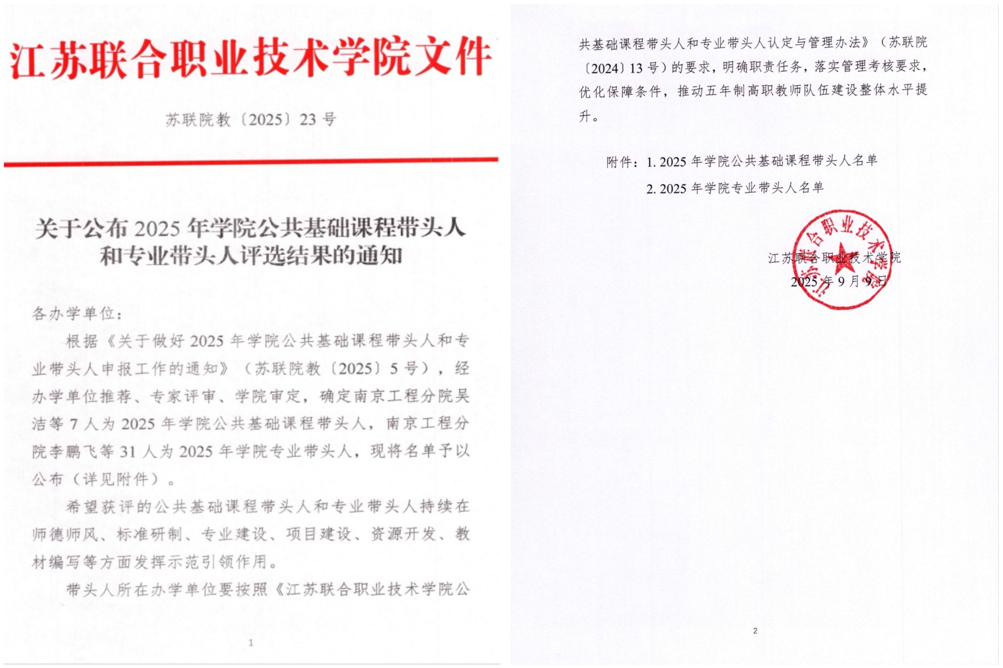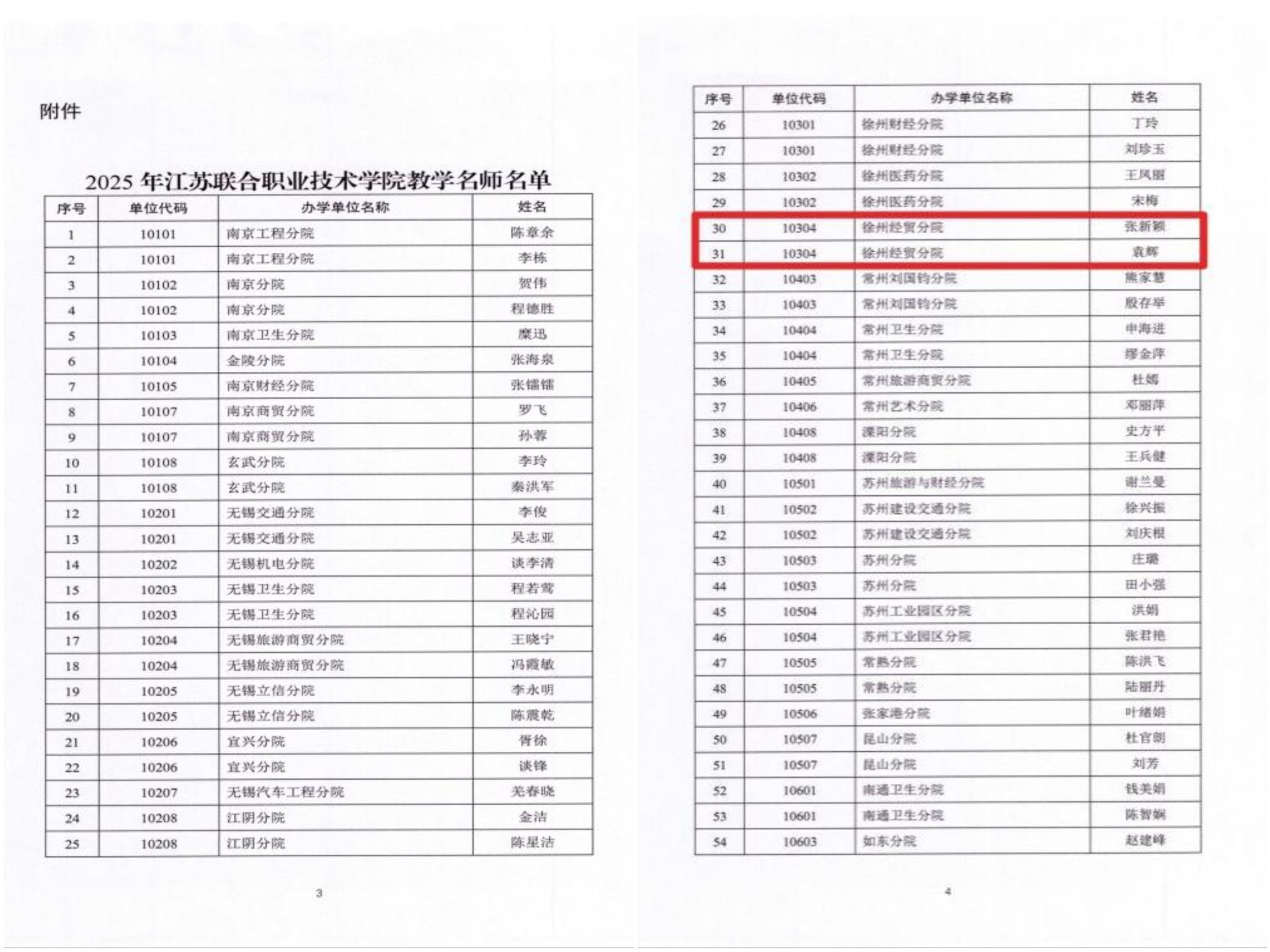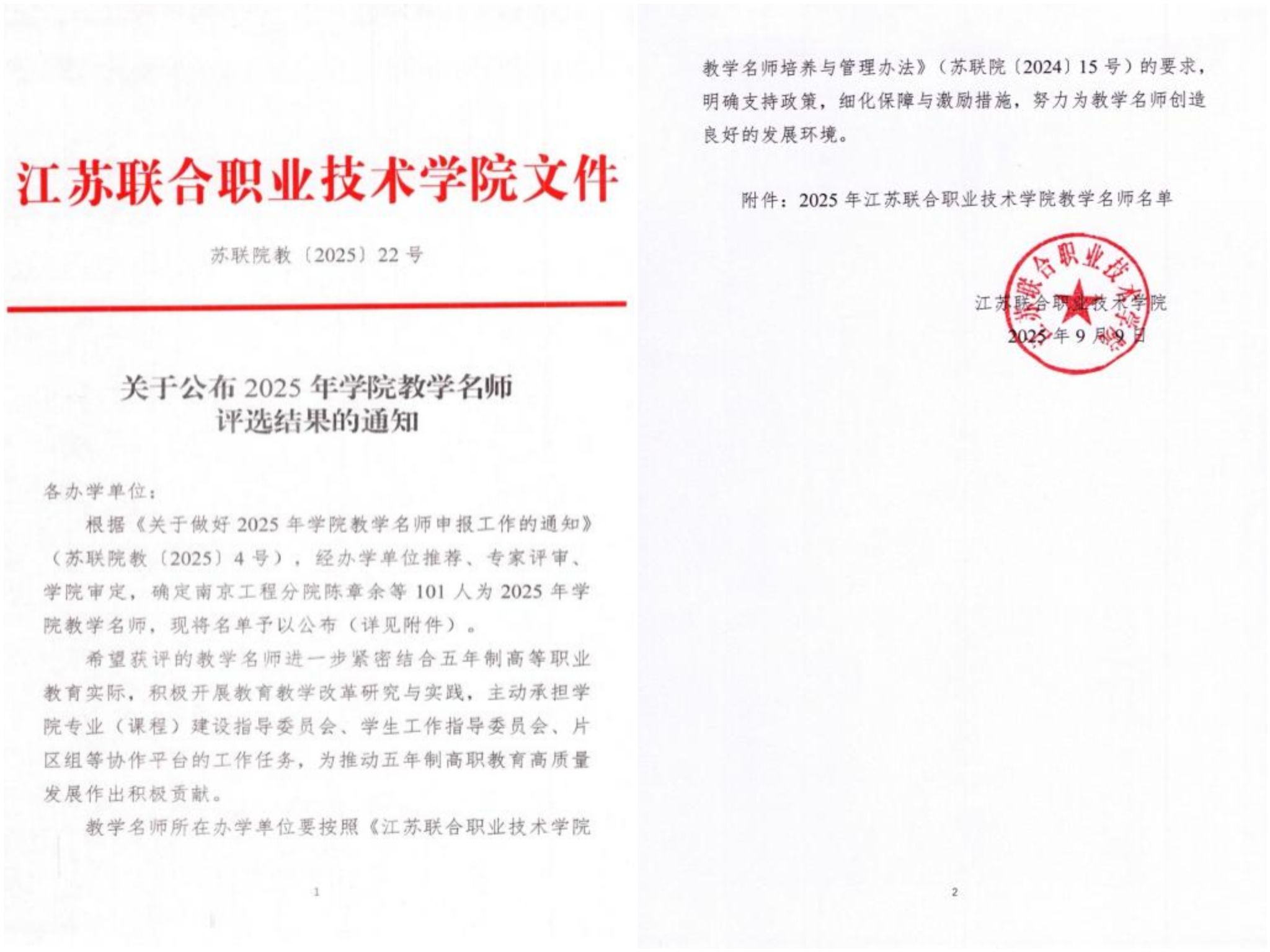 近日,江苏联合职业技术学院公布了2025年度教学名师、专业课带头人及教师教学创新团队立项建设的评选结果。我校张新颖老师和袁辉老师获评“学院教学名师”,杨家印老师获评“学院专业带头人”,曾华娟老师领衔的团队获批立项“学院教师教学创新团队”。