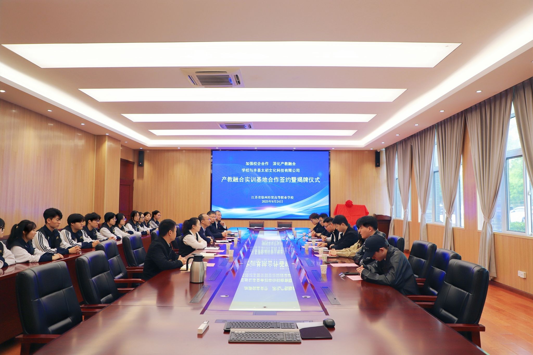 9月24日上午,我校与太初文化科技有限公司(以下简称“太初科技”)校企合作签约暨校内产教融合实训基地揭牌仪式在学校智能会议室成功举行。太初科技副董事长王健康、总经理程韦齐、副总经理滕洁率核心团队共8人出席;我校党委书记、校长刘芳铭,党委委员、副校长袁剑锋,教务处负责人,商贸系领导班子及参与直播实践的学生代表全程参会。仪式由商贸系主任郑海涛主持。
