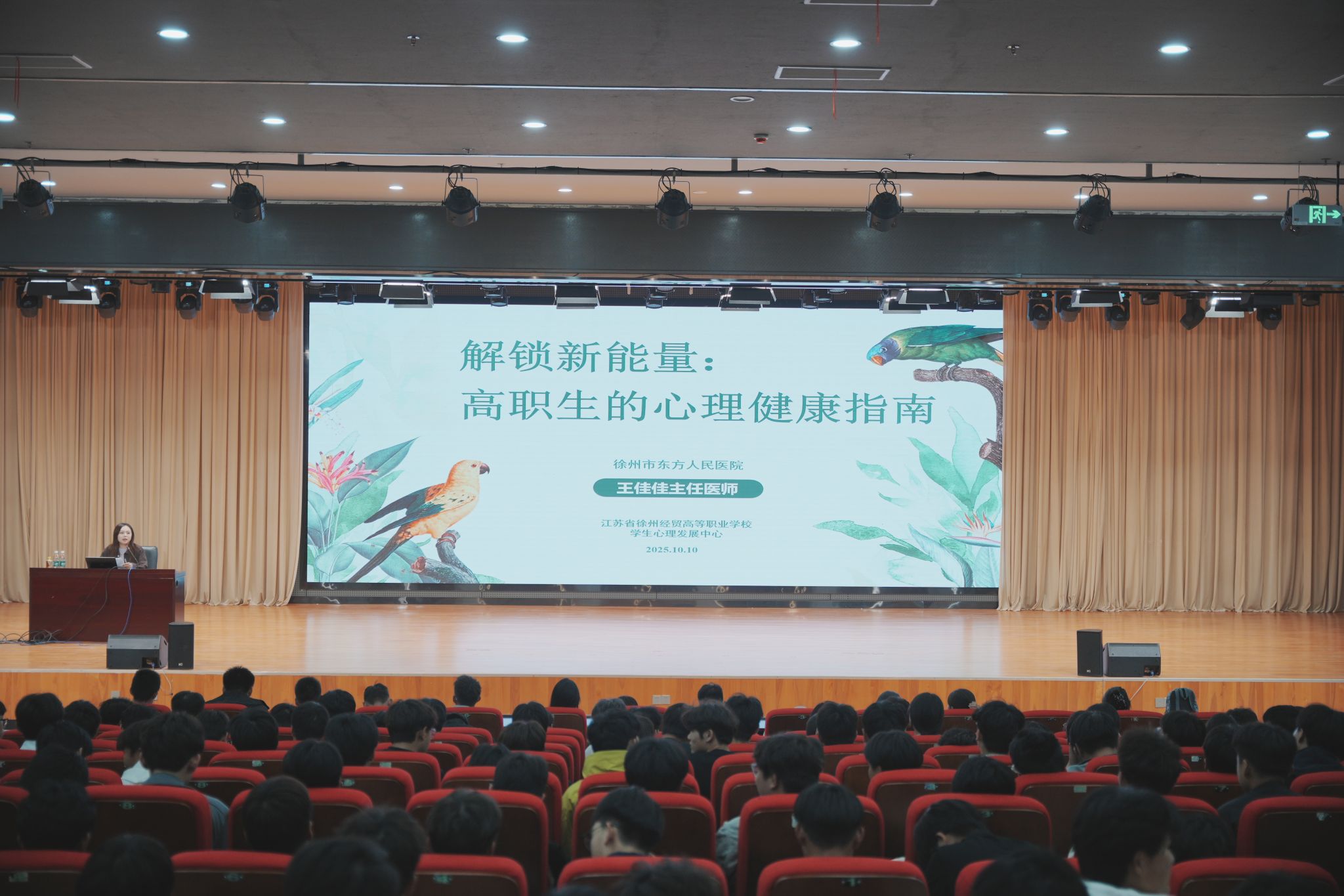在2025年10月10日世界精神卫生日来临之际,我校特邀徐州市东方人民医院王佳佳主任,在学术报告厅开展“高职生心理健康指南”专题讲座。本次讲座由校“润心”专班办公室主任、马克思主义学院院长顾丹主持,2025级新生现场聆听,其余学生通过线上直播同步观看。