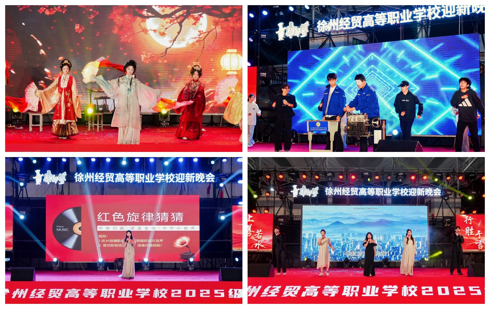 整台晚会以“新”之所向 “经”彩启航为主题,传统与现代交织,技艺与艺术交融,声乐、舞蹈、传统艺术、技能展示等各类节目轮番上演,铺展出一幅文化交融、活力跃动的青春画卷。开场《校歌》合唱以激昂旋律凝聚共识,奏响奋进序章;徐州幼专女子群舞《能不忆江南》水袖轻摇舞步蹁跹,勾勒出江南水乡的婉约诗意;《蒙眼拆装发动机》凭借精准娴熟的技能操作,生动诠释了工匠精神的当代传承。歌曲《孤勇者》《如愿》深情演绎青年一代对理想的坚守与未来的憧憬;舞狮《男儿当自强》雄劲奔放,锣鼓铿锵间尽显浩然气魄;啦啦操与古典舞《红楼梦》以时尚动感对话传统典雅,点燃全场激情。听歌识曲与红色知识问答互动环节,寓教于乐、融情于思,厚植家国情怀。