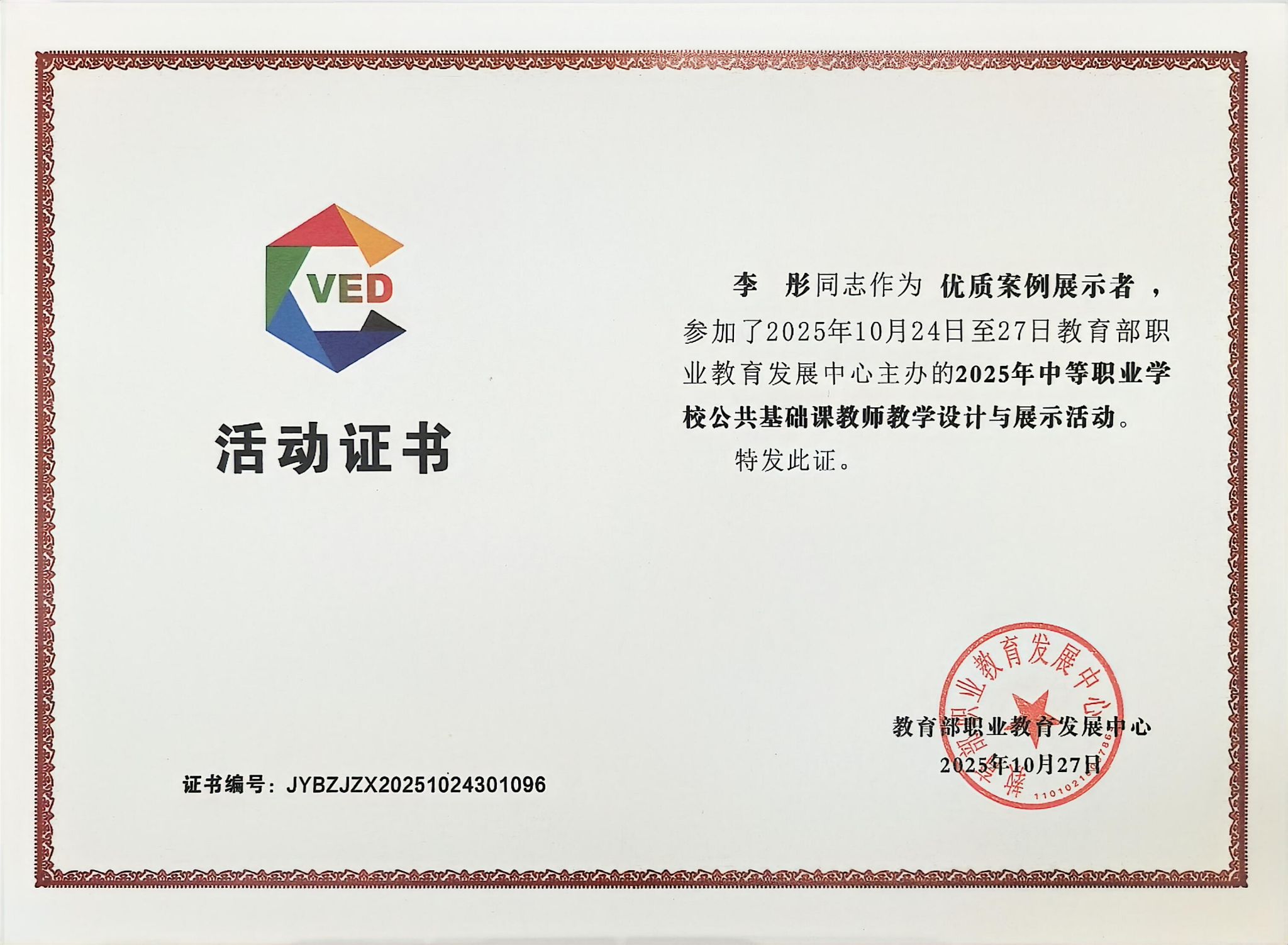 10月27日,由教育部职业教育发展中心主办的2025年全国中等职业学校公共基础课教师教学设计与展示活动在青岛圆满落幕。本次活动汇聚全国31个省(自治区、直辖市)及新疆生产建设兵团近2000名优秀教师代表,开展高水平教学设计展示与经验交流。我校教师首次亮相该赛事,公共基础部李彤老师成功获评“优质案例展示者”,其案例将由高等教育出版社在全国推广。