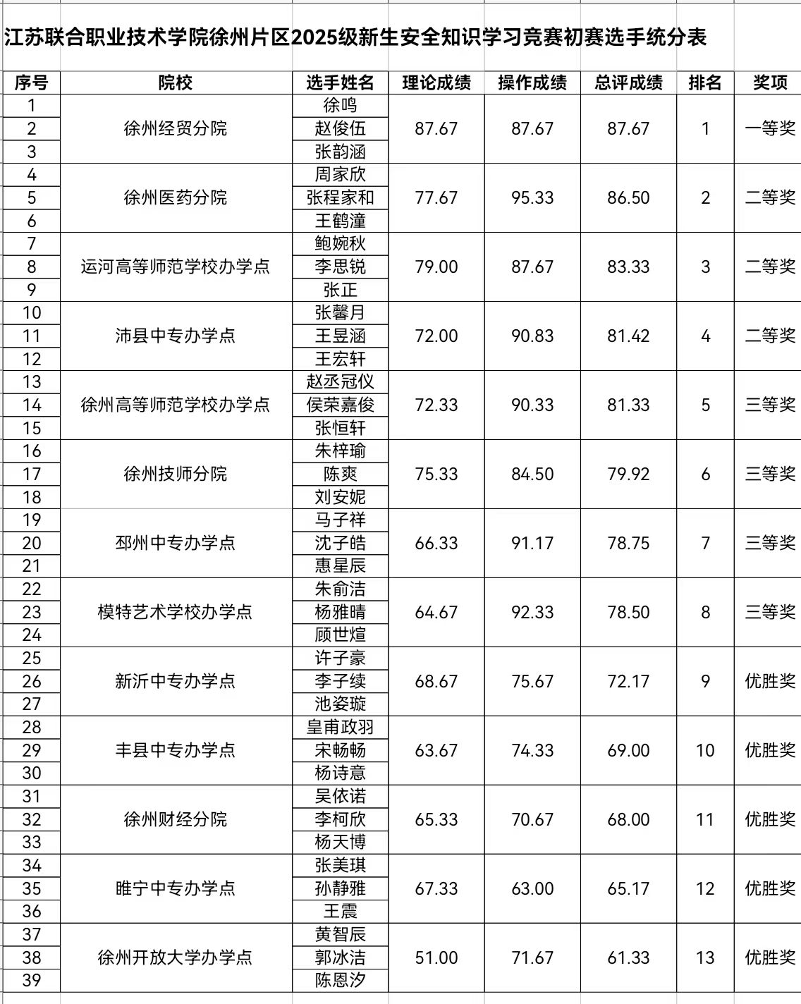 按《江苏省联合职业技术学院关于开展2025级新生安全知识学习竞赛的通知》(苏联院学[2025]10号)文件精神,学校于11月5日开始组织2025级高职新生参加活动,截止到11月20日0时,2025级高职学生共1129人全部通过课程学习和测评。同日,联院徐州片区工作组(徐州医药分院)下发《关于开展联院徐州片区2025级新生安全知识竞赛初赛的通知》,11月12日经保卫处、学工处共同筛选,选拔出会计高本251班赵俊伍、徐鸣、张韵涵三位同学,组建队伍参加初赛。经过8天的培训、训练,11月20日,孙峰、魏子栋带队前往徐州医药分院参加初赛,初赛项目包括线上答题和线下实操,经过激烈的角逐,我校代表队在徐州片区的十三支队伍中脱颖而出,以总分第一名的成绩荣获一等奖,顺利进入联院复赛。